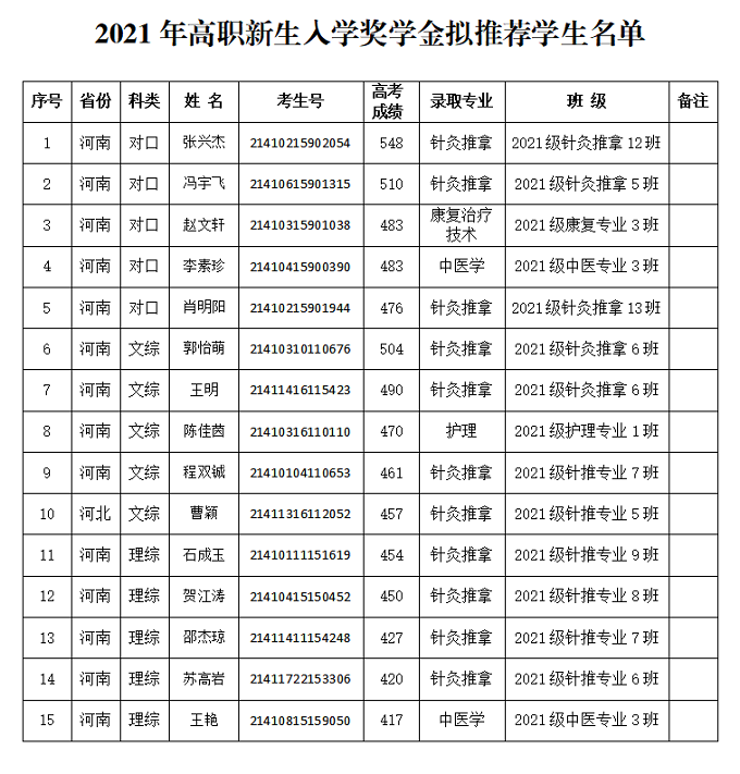 根据《河南推拿职业学院入学奖学金评定办法》,招生就业处提供2021年文理科、对口升学成绩各前10名学生信息,学生处(学生资助管理中心)学籍核实无误后按照成绩排名初评各前5名学生,经学院学生资助工作领导小组审定,拟推荐张兴杰等15名学生获得学院2021年高职新生入学奖学金,现予以公示,公示期为:2021年11月9日-15日,如有异议请于公示期内向学生处反映。