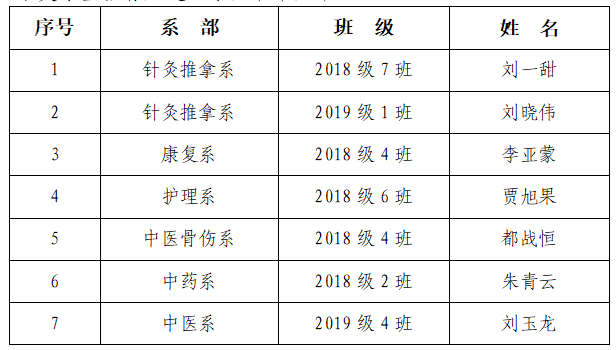 按照《河南省教育厅办公室关于做好2020年高校学生国家奖助学金评审发放工作的通知》(教办资助〔2020〕184号)要求和《河南推拿职业学院学生奖助学金评定办法》(院政〔2020〕66号)规定,经学生个人申请,系部学生资助工作组初步评议,学生处(学生资助管理中心)审查,学院国家奖学金评审小组民主评议,学院学生资助工作领导小组审定,拟推荐针灸推拿系刘一甜等7名学生为学院2020年国家奖学金推荐人选,学生名单如下: