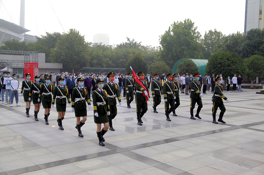 升旗仪式前,党委副书记杜占彪和学院国旗护卫队、学生代表等在视频会议室共同在线观看了天安门广场升国旗仪式。仪式结束后,杜占彪同志以“神圣、纪律、力量、自豪”等关键词与大家进行了分享交流。他说,今年国庆与中秋再“团圆”,亿万国人在与家人欢聚的喜悦之上,又增添了一份为国庆生的荣光。他希望同学们不负青春、不负韶华、不负时代,为实现中华民族伟大复兴的中国梦贡献青春力量。