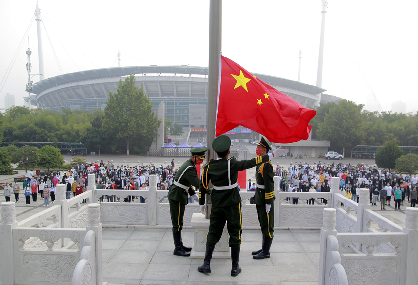 7时20分,升旗仪式正式开始。学院国旗护卫队身着戎装、雄姿英发,迈着整齐而矫健的步伐护送国旗走到升旗台。在雄壮的国歌声中,鲜艳的五星红旗冉冉升起。在场师生全体肃立,向国旗行注目礼,向庄严神圣的国旗表达最崇高的敬意,祝福伟大的祖国更加繁荣富强。
