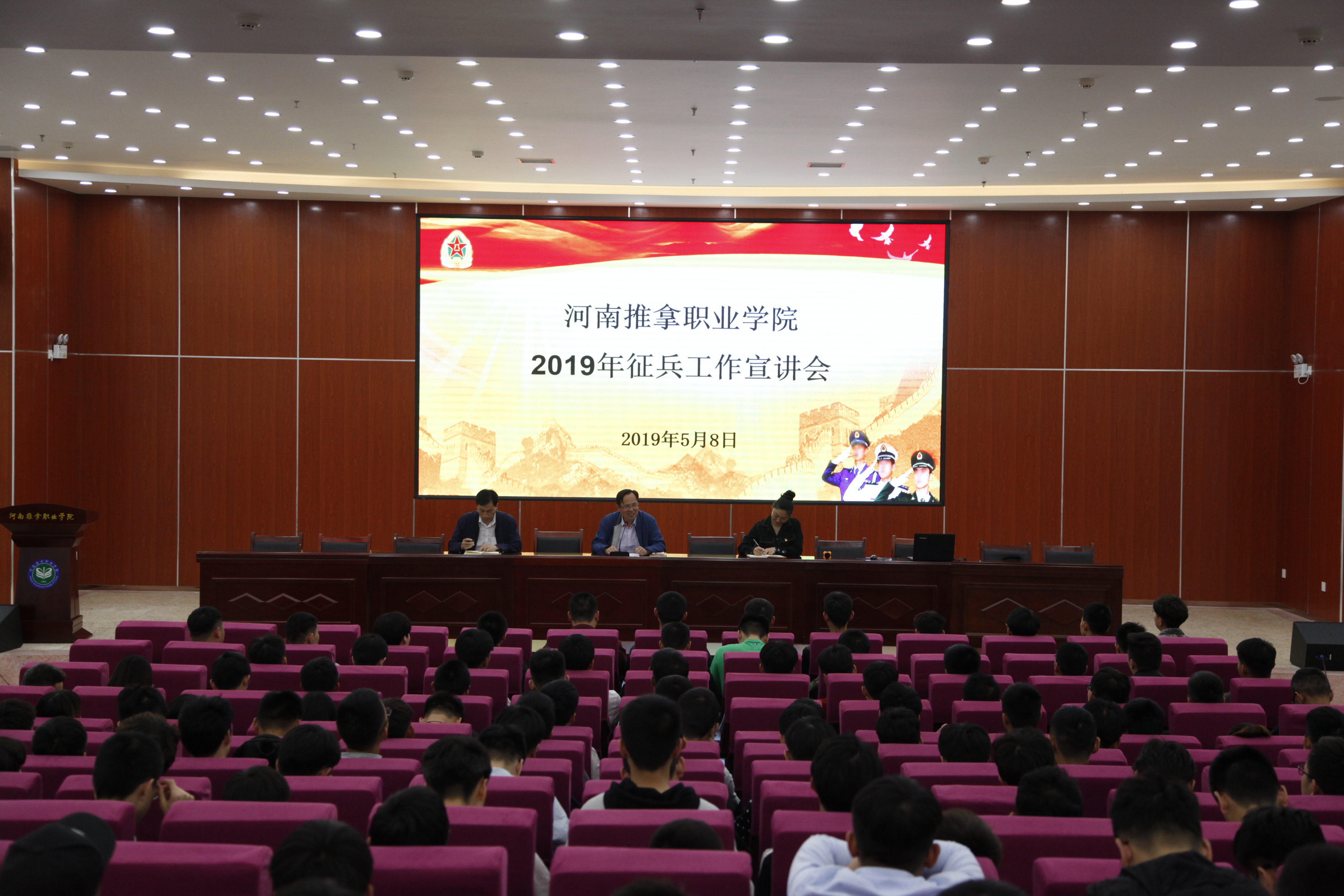 为切实做好我院2019年大学生应征入伍工作,武装部于5月8日下午在图书馆一楼报告厅开展了大学生征兵工作专题宣讲会。武装部部长高勇,副部长马珊、孙俊峰及武装部干事、300余名大学生参加。会上,高勇同志首先对在座的300余名拥有军人情结的大学生给予了肯定和鼓励,并就应征入伍所带来政治账、发展账和人生账进行了认真讲解,对国家、省、市、学院给予应征入伍大学生优惠政策也进行了详细解读。之后,我院退役复学大学生白玺华从个人从军经历、应征入伍的十大好处以及个人应征入伍享受到的各项优惠政策作了专题宣讲,鼓励同学们积极应征入伍,赢得阵阵掌声。最后,高勇同志以习近平总书记给南开大学8名新入伍大学生的回信为主线,鼓励大学生要响应号召,积极应征入伍,切实把个人的爱国之心转化为报国之行,在部队淬炼成钢,书写绚烂、无悔的青春篇章。
